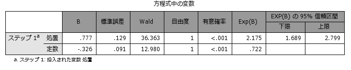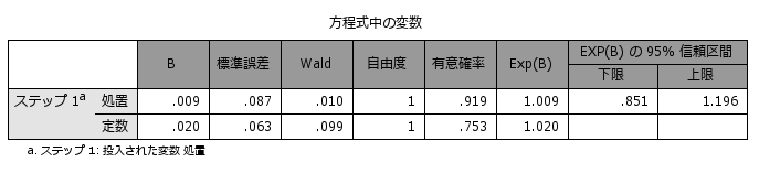 傾向スコアの推定に用いられる代表的な分析手法は、ロジスティック回帰分析です。研究目的の本来のアウトカムではなく、2群への割付を意味する処置変数を従属変数、交絡要因となっている共変量を説明変数として用いたロジスティック回帰分析を実行して、介入群に割り付けられる確率を変数として保存します。