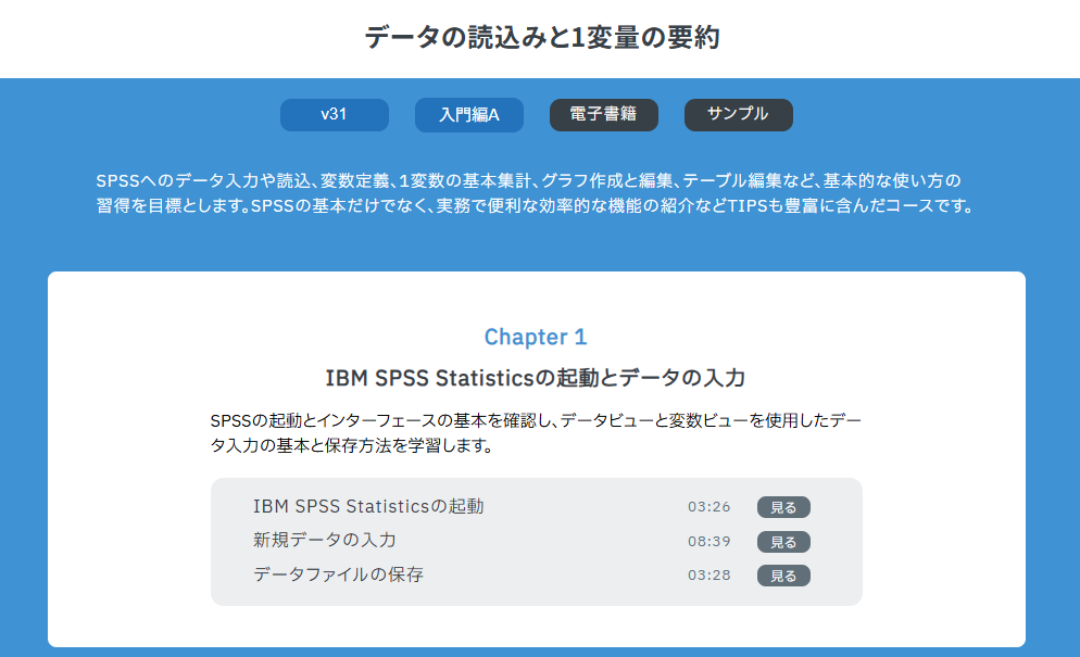 1 | IBM SPSS Statisticsの起動とデータの入力SPSSの基本操作、データビューや変数ビューの機能、データの入力方法を学習します。 | 16分 |