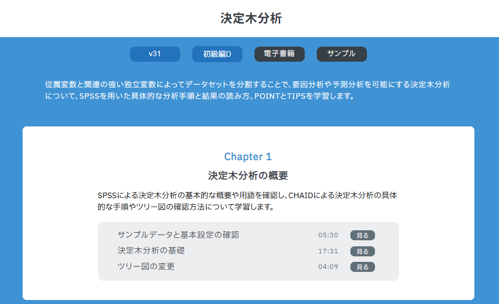 1 | 決定木分析の概要決定木分析の基本的な概要や用語を確認し、操作手順とツリー図の確認方法を学習します。 | 28分 |