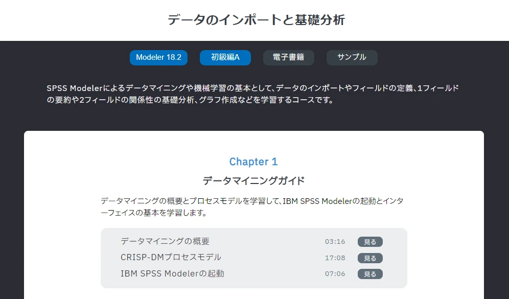 1 | データマイニングガイドデータマイニングの概要とプロセスモデルを学習し、Modelerのインターフェースを確認します。 | 28分 |