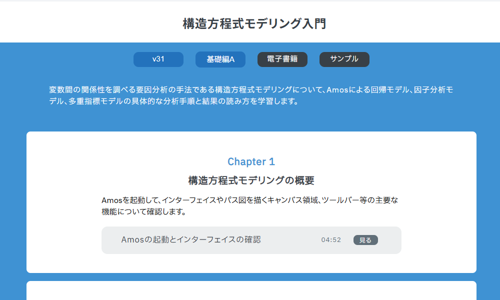 2 | 回帰モデルとパス解析モデルパス図の作成の基本として回帰モデル、パス解析モデルの作成方法を学習します。 | 51分 |