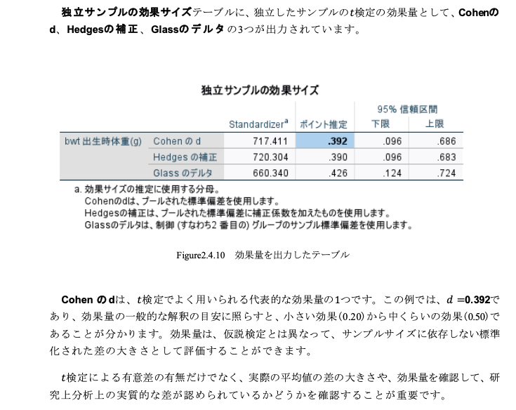 出力した結果の解釈方法を丁寧に解説しています。例えば、なぜ有意確率だけでなく信頼区間を見なければいけないのか、どのように読み取るのか、効果量の解釈なども理解できます。