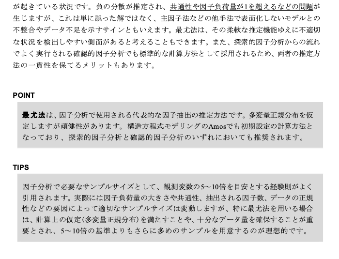 例えば、因子分析の結果も因子負荷量をどう読み取るか、どのように解釈して、因子にどのようなネーミングをするか、その注意点などを解説しています。